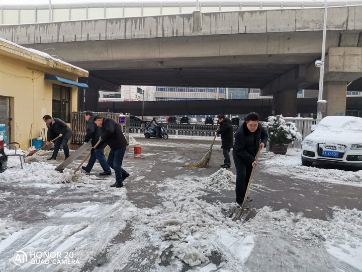 1月5日,石家庄市迎来了2020年第一场雪,大地一片银装素裹。然而,近一天的强降雪,也给人们的出行带来了不便。为保障干部职工群众出行安全,防止发生因雪天路滑造成意外伤害,1月6日清晨,省食品(医保)公司领导班子带头,提前来到单位,积极参与扫雪除冰。大家不畏严寒,团结协作,经过一个多小时的奋力清扫,将公司门前台阶和停车场以及门口的马路积雪全部清扫完毕,并铺上了防滑垫,张贴了防滑警示牌,为职工们及来进出口大厦办事的人员提供了安全保障,也温暖了每一位职工的心。(河北食品公司供稿)