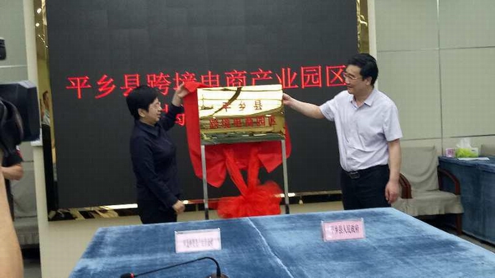 签约仪式后,张元贞与贾芳共同为“平乡县跨境电商产业园区”成立揭牌。