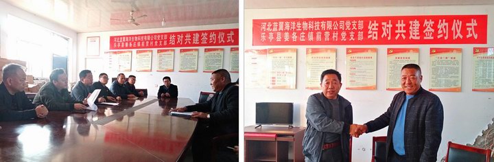 为深入贯彻落实“基层党建质量提升年”活动部署,进一步发挥党建引领作用,不断探索基层高质量党建工作新模式,形成“优势资源互补,相互促进提高”的工作新格局,2020年11月6日,河北蓝翼海洋生物科技有限公司党支部与乐亭县姜各庄镇前营村党支部在前营村党员活动室举行了结对共建签约仪式。