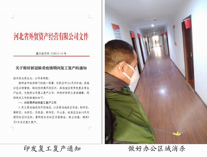 公司总部相关部室严格落实专题会议要求,积极做好复工复产准备工作。一是做好复工复产防控物资保障工作,多渠道筹集口罩、消毒液、测温仪、喷雾器等防疫用品。二是严格落实防控措施,在办公区域出入口处设置疫情防控检查点,专人负责出入人员检测、扫码、登记、消毒,每天对办公楼、食堂、院落区域进行全面消毒,并做好人员轨迹检查、健康日报填写等工作,确保疫情防控不留死角、不留隐患。三是坚持“以宣促防”,通过文件、公告、公众号、微信群等多种方式为员工提供实时有效的防护资讯,坚持“不聚集、少走动、少开会”的原则,公文流转、请示汇报以OA系统、邮件、电话等方式为主。四是随时关注石家庄市疫情防控动态,按照职工所处不同风险等级区域,分区组织职工返岗,及时为返岗职工开具复工复产证明,确保低风险地区职工全员到岗。