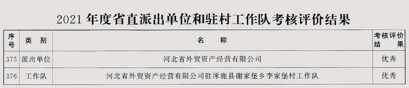 近日,中共河北省委组织部下发《关于2021年度省直派出单位和驻村工作队考核评价结果的通报》,我司作为省直派出单位及驻工作队考核评价均为“优秀”等次。