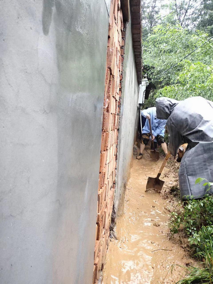 由于山坡冲刷下来的泥土堵住排水口,形成了一米多深的淤泥,村民家住房告急,应急救援小组成员冒大雨进行及时处置,经过近两个小时的疏通,排除险情。