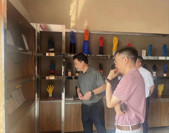汇富三合总经理赵际尧对张元贞一行的到来表示欢迎,并详细介绍了企业发展现状和作为“专精特新”企业在各种手套的研发生产和国内外销售渠道建设方面取得的成绩和经验,重点介绍了行业和公司本身的出口优势、行业发展趋势和企业前景。
