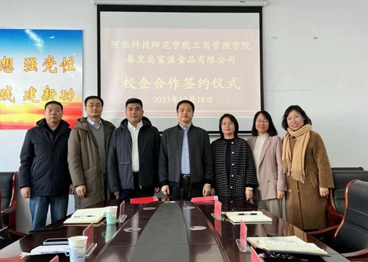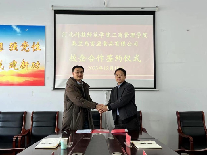 为深入贯彻落实创新驱动发展战略,深化校企合作和产学研融合,促进企业高质量发展,12月18日,秦皇岛富滋食品有限公司与河北科技师范学院工商管理学院在河北科技师范学院主校区举行了校企合作签约仪式。河北科技师范学院工商管理学院院长刘海滨、院党委副书记韩晓霞、副院长刘艳芳,公司党委书记、董事长王建亮,党委副书记、总经理王宪及相关部室负责人出席了此次签约活动。