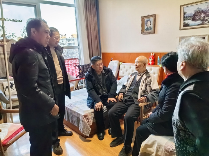 在新春佳节即将来临之际,2024年1月22日下午,省国资委党委委员、副主任杨建文带队走访慰问省外贸资产公司91岁离休干部、老党员张家模。省国资委党建处处长郭军平、宣传外联处处长张瑞娥、省外贸资产公司党委副书记齐山水陪同慰问。