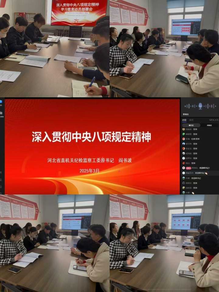 会议认真落实上级部署要求,深入学习习近平总书记关于深入贯彻中央八项规定精神学习教育的重要讲话和重要指示精神,传达学习《中共中央办公厅关于在全党开展深入贯彻中央八项规定精神学习教育的通知》和中央八项规定及其实施细则精神,集体观看了河北省直机关纪检监察工委原书记闫书波《深入贯彻中央八项规定精神》的直播课,安排部署河北世贸通学习教育工作。