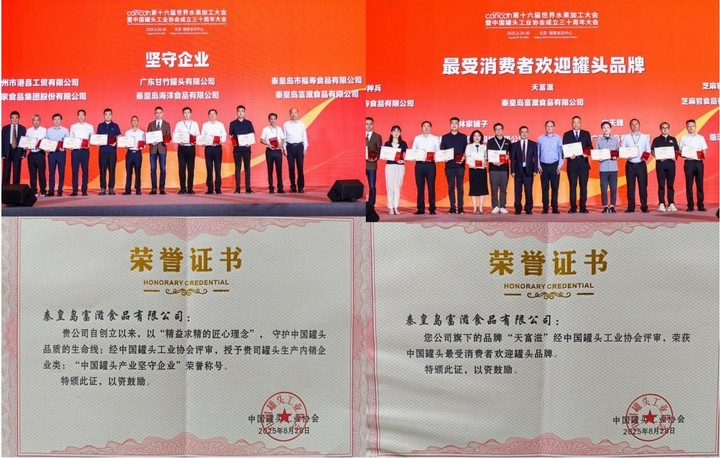 秦皇岛富滋食品有限公司荣获中国罐头产业两项重要荣誉