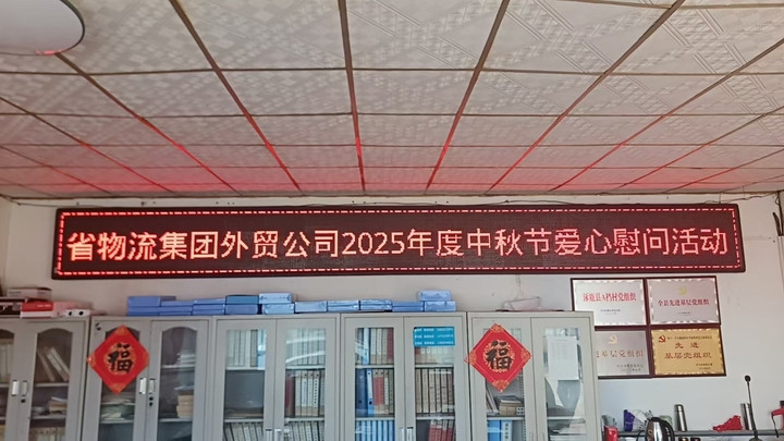 慰问活动在村党群服务中心启动。电子显示屏上“省物流集团外贸公司2025年度中秋节爱心慰问活动”的红色标语格外醒目,文件柜上张贴的“福”字与“全县先进基层党组织”荣誉牌匾相映成辉,营造出温馨祥和的节日氛围。
